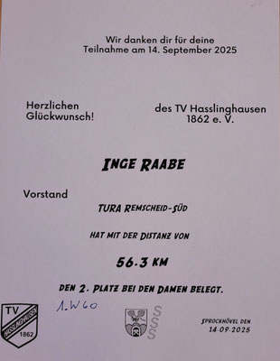 Inge Raabe mit ihrer Routine bewältigte innerhalb der festgesetzten Zeit eine Strecke von 50,62 km und gewann damit ihre Altersklasse W60. Mit dieser Leistung
