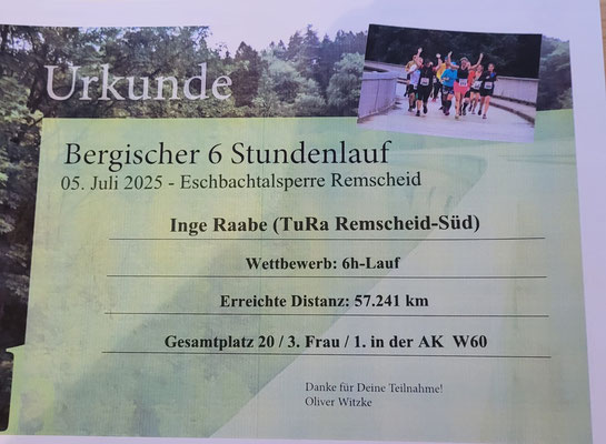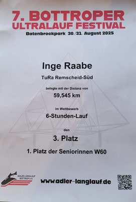 Inge legte in 6 Stunden eine Strecke von 59,545 Kilometer zurück und gewann ihre Altersklasse W60 und wurde dritte Frau im Gesamtfeld.
