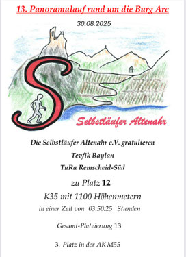 Er startete in Altenahr beim 13. Panoramalauf im Wettbewerb K35 mit 1100 Höhenmetern auf einer sehr schönen, aber auch anspruchsvollen Strecke rund um die Burg